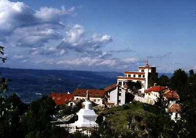 A beautiful 12 meter high stupa in France (1986). There is a website, but it is in French. Bablefish (Altavista) will translate, very badly:"It is a place withdrawn in mountain, with 850m of altitude, between Grenoble and Valence, over the buttresses of the Solid mass of Vercors, it dominates the valley of Isère." |