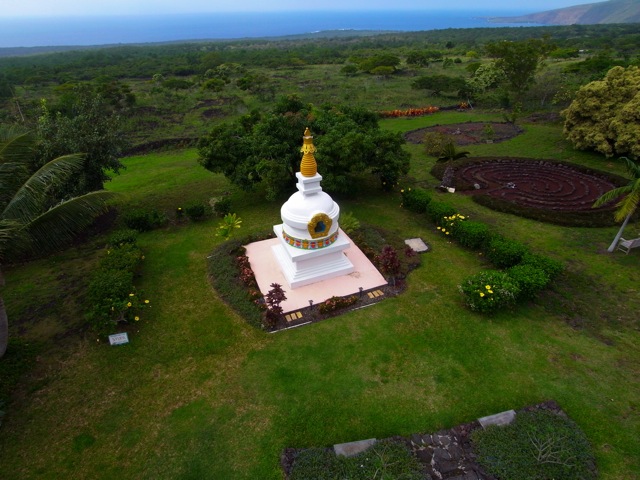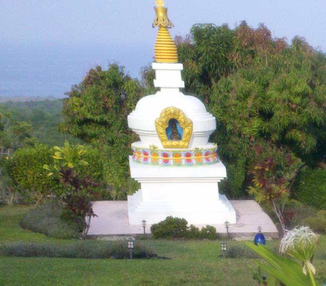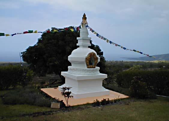 "This is a Kalachakra Stupa on our property dedicated to the Venerable Kalu Rimpoche. It was built in 1991. The treasure vase was placed by H.E. Jamgon Kongtrul and built under the direction of H.E. Tai Situpa. Venerable Bokar Rimpoche dedicated and opened the Stupa. We welcome this connection. We are currently putting together a website and we would appreciate being placed on your list of Stupas. Our center is available for spiritual retreats, workshops and conferences. Paleaku is a 9-acre botanical healing sanctuary and community resource center. It is located near Pu'uhonua O' Honaunau, "Place of Refuge" on the Big Island of Hawaii. Home to ancient sites sacred to the Hawaiians, the name Paleaku, meaning "soft covering" was given by the Kapuna and Kahuna of Hawaii. Our gardens are designed to foster a personal relationship to the earth. We offer private sitting spaces and pathways that weave through beautiful vistas. We welcome all journeyers to enjoy our place of beauty and peace during their travels to Hawaii."