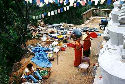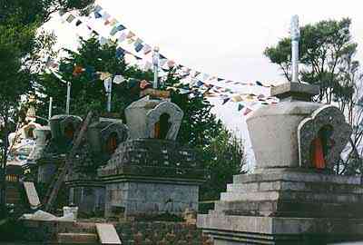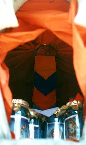 The two lamas preparing to "stuff" the bumpas. The bumpa (vase section) contains a great deal. First material is fitted all around the inside to make it more like a room (shrine). Then succesive layers of blessed objects of many sorts are fitted. |